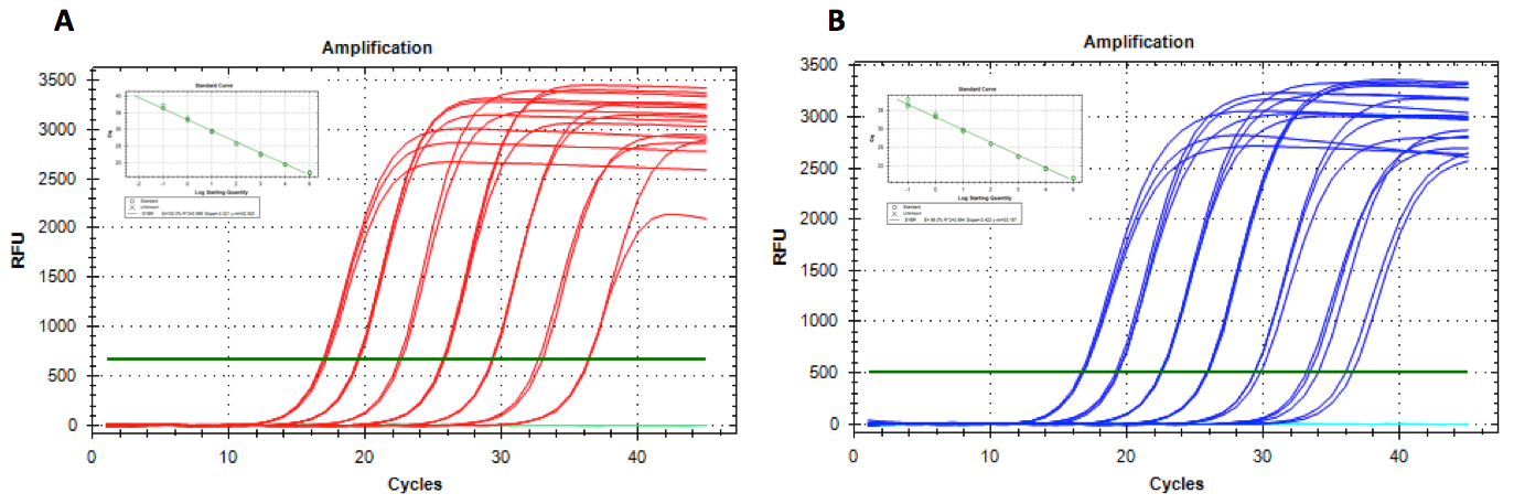 图2. BlazeTaq? One-Step SYBR? Green RT-qPCR kit(红色)与Competitor T试剂盒(蓝色)产品的性能比较。对HeLa细胞RNA提取物中GAPDH和Actin水平进行分析,RNA提取物以10倍梯度稀释成7个样本,总量的范围为100 ng至0.1 pg。 A.HeLa细胞提取物中GAPDH扩增曲线的比较; B.HeLa细胞提取物中Actin扩增曲线的比较。