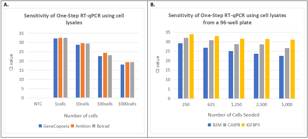 A.在试管中的应用,使用GeneCopoeia、Ambion或BioRad的裂解缓冲液裂解HCT116细胞,使用GAPDH基因进行RT-qPCR分析。取浓度范围为5 ~ 5000个细胞每微升的悬浮细胞与裂解缓冲液混合,按照各产品的操作说明书进行处理。每RT-qPCR反应使用2μl细胞裂解液(相当于1-1000个细胞每反应)。