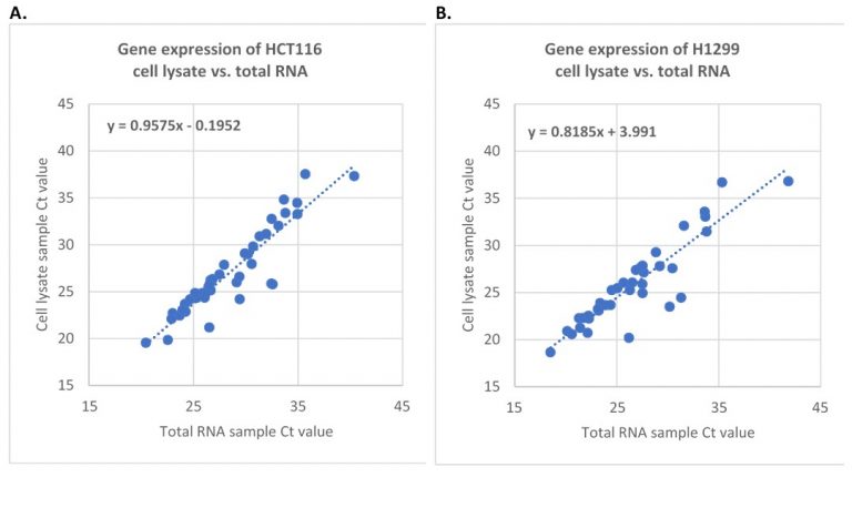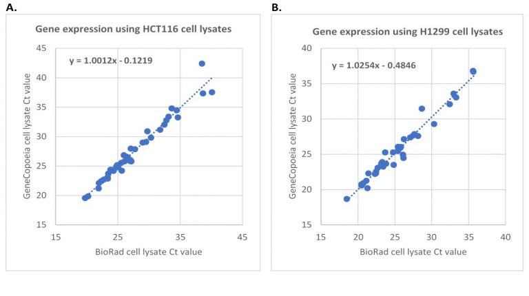 图三:使用Genecopoeia(纵坐标)和BioRad(横坐标)的lysis buffer分别处理相同数量的细胞,通过One-Step RT-qPCR检测基因表达情况。每个反应的细胞量约为1500个。A. 检测HCT116细胞的43个基因。B. 检测H1299细胞中的37个基因。